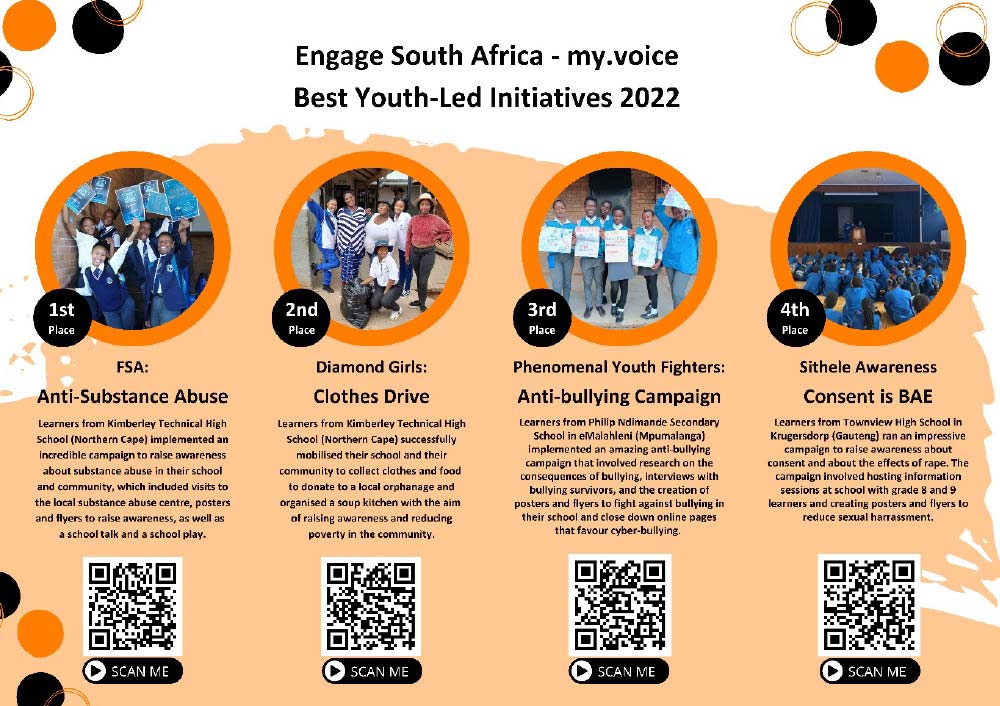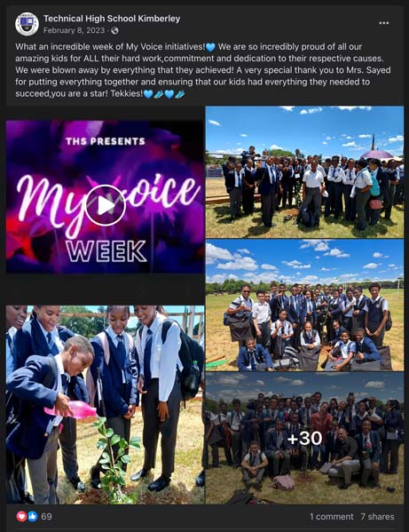 - my.voice Week at Kimberly Technical High: https://www.facebook.com/thstekkieskimberleysa/posts/pfbid028wrBFzwoSSqBE8wHfuybazWSvLfmZjJsMF7VX9QAiRUvGbzhmWJY3Xr5NHHKdrMjl