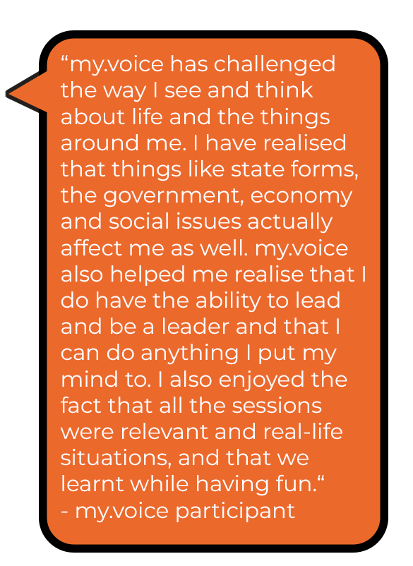The my.voice programme takes participants through an experiential journey of self, others and society, exploring the following topics: