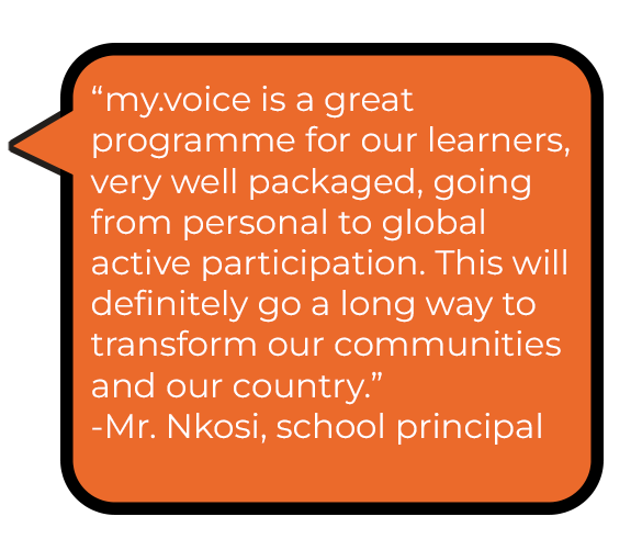 my.voice is an 8-session Leadership and Civic Education programme for high-school-age youth in South Africa that helps young people develop the knowledge, skills and confidence to find their voice as young leaders and become active members of their schools and communities. Each session is 2 hours long and can be implemented afterschool, over the weekend or during school holidays.